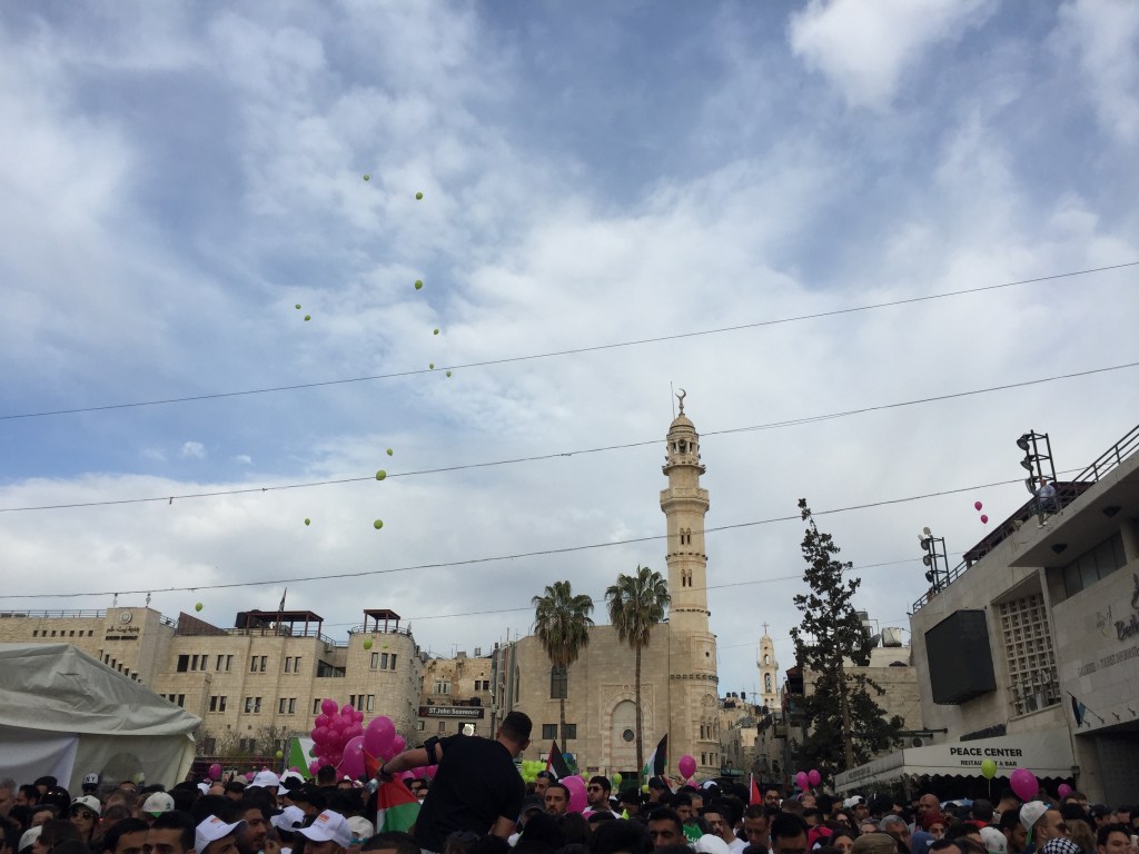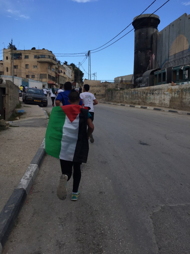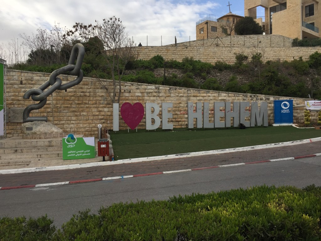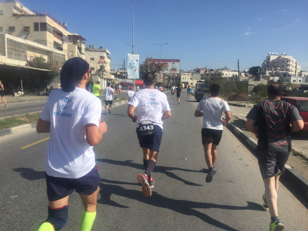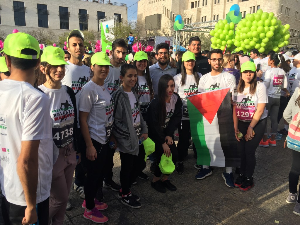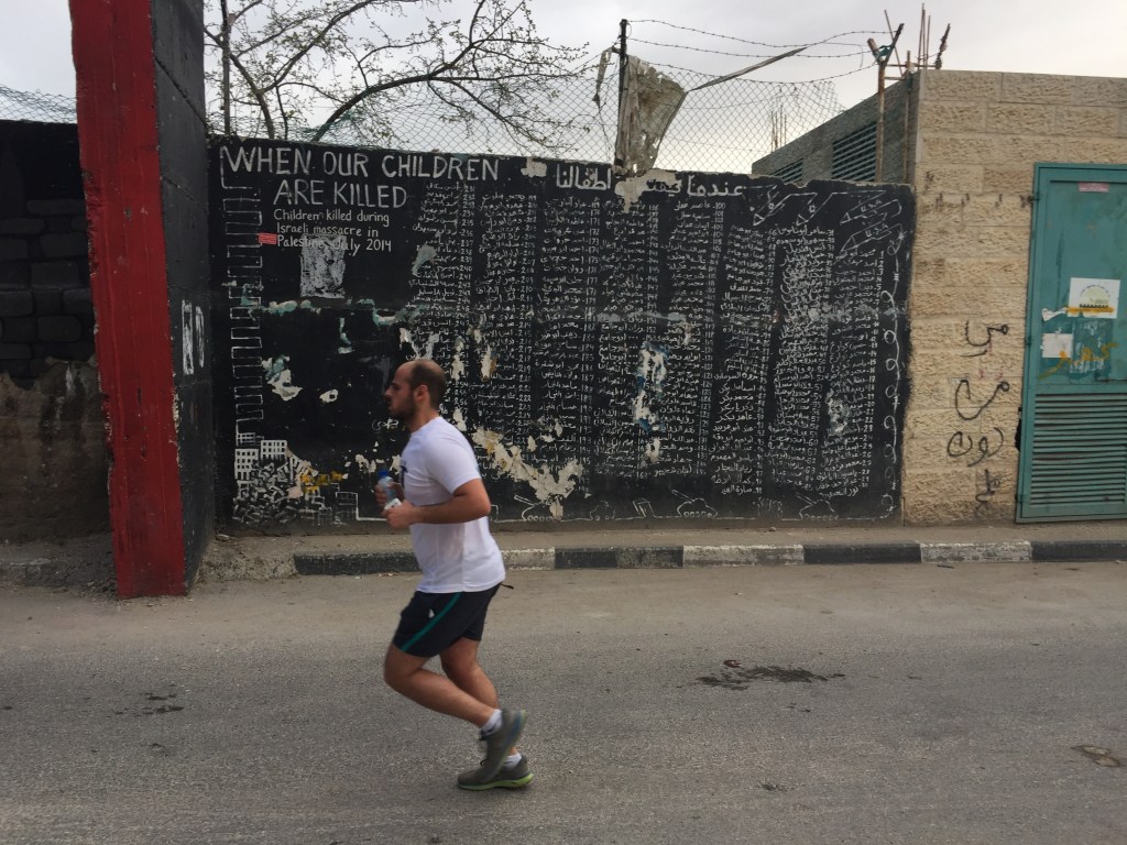 I could write for a long time about this episode and what it means to me, but I’ll try to keep it brief. On March 30, 2017, I travelled with my friend Aislinn, who was also taking Arabic classes at Ali Baba, to Bethlehem, Palestine in order to run in the “Freedom of Movement” Marathon. Neither of us had ever been there, and it seemed like a great opportunity to visit. We took a taxi from Amman to the border, waited in a long line to be admitted, and then hired a van with some other runners we met at the border to get to Bethlehem. Funnily enough, when Aislinn and I arrived in Bethlehem, there was no room at the inn (where we had reserved a room). We were so late in arriving after the long delay at the border that they assumed we weren’t coming. But instead of pointing us to a stable to sleep, they gave us a room at a different hotel. The next morning, we put on our running shoes and headed to the plaza at the Bethlehem Peace Center to start the race. I wasn’t running the full marathon, just the half, but it was gonna be a challenge for me because I wasn’t exactly in shape at the time. I hadn’t even brought running shoes to Jordan (Amman’s a super hilly place), but I managed to score a pair of Brooks at a flea market a couple weeks before the race. I ended up losing those shoes on a train in Germany a few years later, but that’s another story.